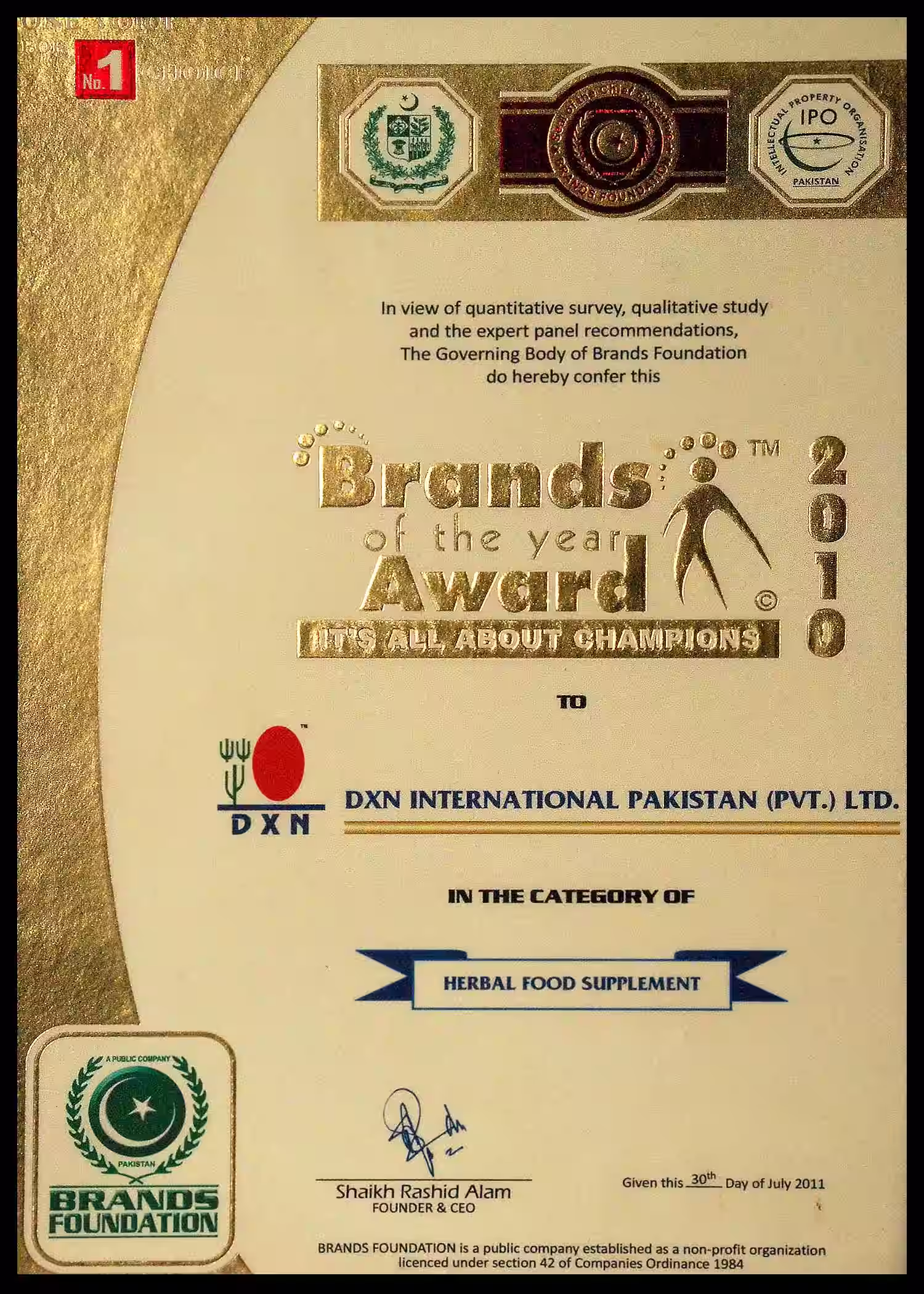 DXN螺旋藻被选为巴基斯坦最佳膳食补充剂,并由巴基斯坦总理优素福·拉扎·吉拉尼授予2010年度品牌奖(由巴基斯坦经理扎里夫·艾哈迈德代表DXN巴基斯坦接受奖项)。