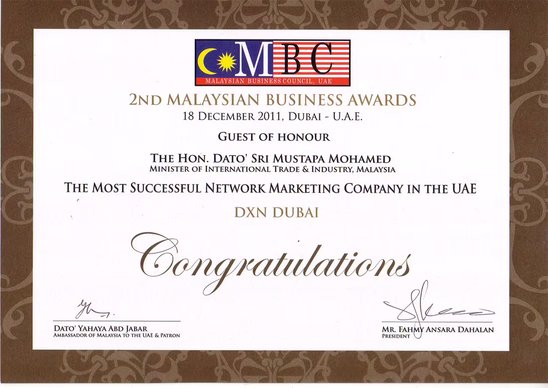 在阿联酋商业委员会举办的第二届马来西亚商业奖颁奖典礼上,DXN被授予阿联酋最成功的网络营销公司奖。该奖项由马来西亚国际贸易与工业部长穆斯塔法·YB·达托于2011年12月18日在迪拜颁发。